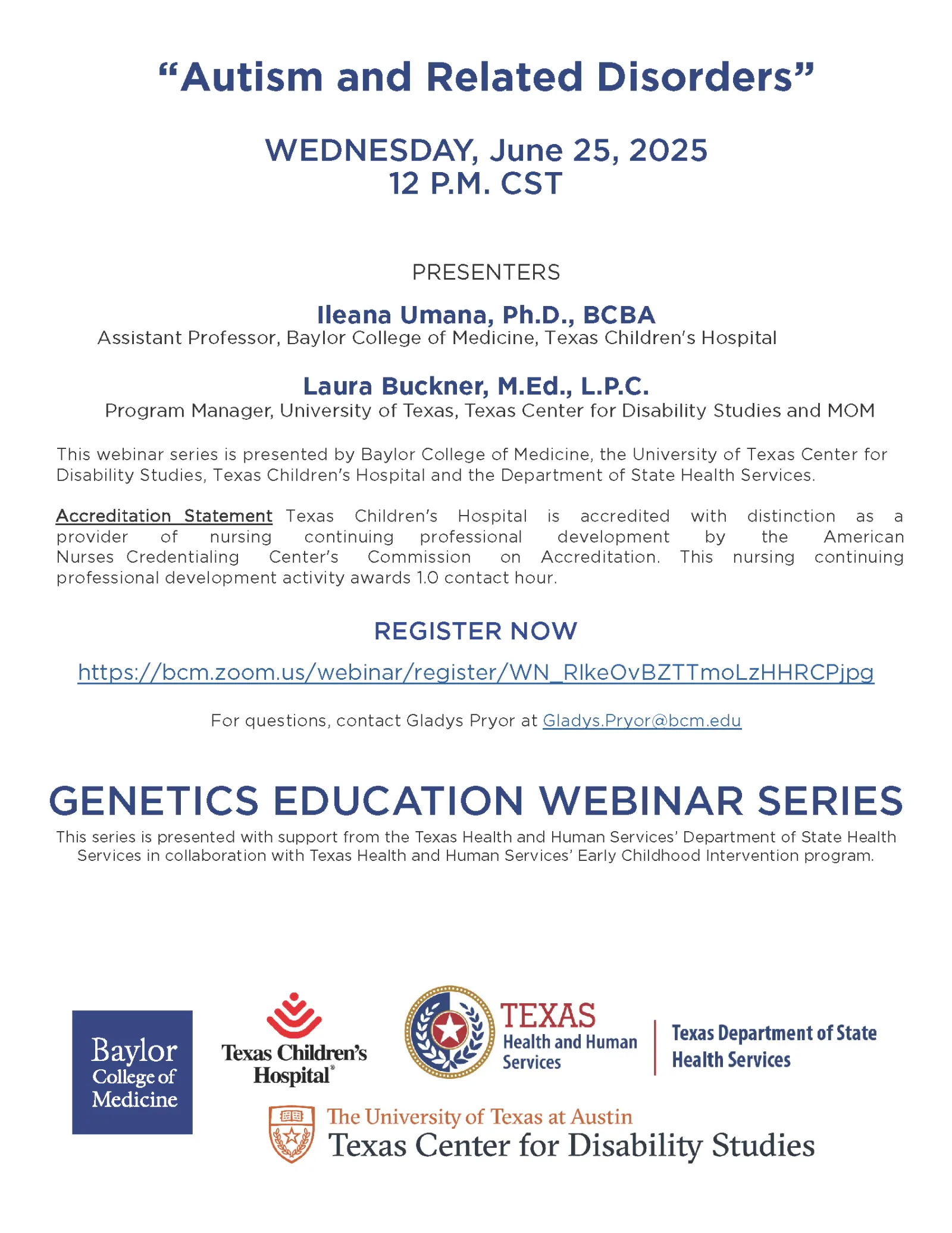 This webinar series is presented by Baylor College of Medicine, the University of Texas Center for Disability Studies, Texas Children's Hospital and the Department of State Health Services.